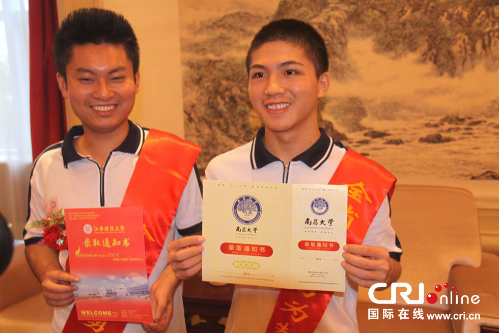 2014年07月09日,江西省宜春市,7月9日,江西“夺刀少年”柳艳兵(左)、易政勇(右)喜获南昌大学、江西财大录取通知书。图片来源:邹海斌/CFP