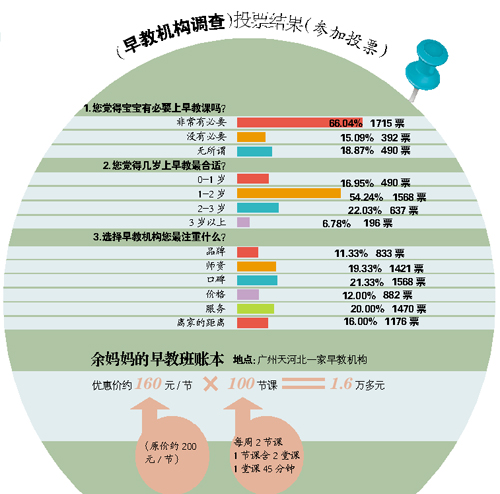 针对市场热度,省早教协会和广州妈妈网作了一份调查。报告显示:有66.04%的妈妈认为宝宝有必要上早教。另外,54.24%的妈妈认为孩子1~2岁上早教最合适。选择早教机构时,口碑、服务、师资是妈妈们比较看重的问题。她们有人遭遇过课程上不满不能退款、教学口号华而不实、非法早教机构“卷款走人”等情况,说明该行业需要监管。