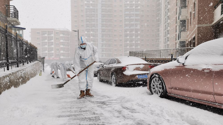 图为大连海洋大学“青年抗疫突击队”队员铲除积雪。(照片由学校提供)