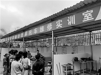 校园一角,摩托车修理实训室里,五六个孩子围着一辆摩托车,跟老师学习如何给摩托车打气。