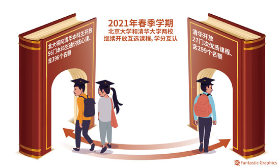 据了解,2021年春季学期,北大和清华互开课程合作再升级,共开放83门课程、695个名额。其中,北大将向清华本科生开放56门通识核心课,含396个名额;清华将向北大学子开放27门优质课程,含299个名额。