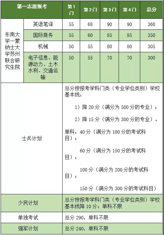 2. 统考考生(不含报考东南大学-蒙纳士大学苏州联合研究生院考生和管理类联考考生)总分超过报考院(系)专业复试线20分以上(含20分),单科(限一门)可降2分。