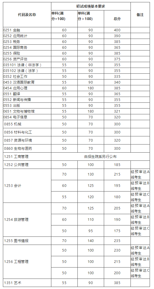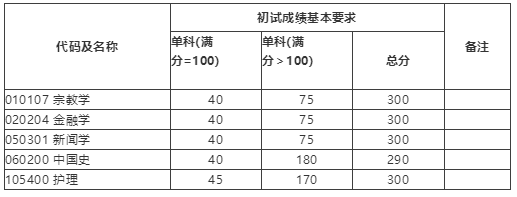 3.“退役大学生士兵计划”:总分满分等于500 分的专业,要求考生总分不低于所报考学科初试成绩基本要求总分10 分;总分满分等于300 分的专业,要求考生总分不低于所报考学科初试成绩基本要求总分5 分。