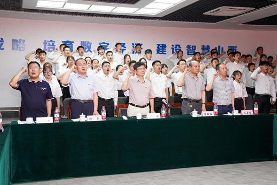太原理工大学师生共同开展党史教育专题学习,全体党员举起右拳,面向党旗合唱歌曲《我宣誓》。太原理工大学供图