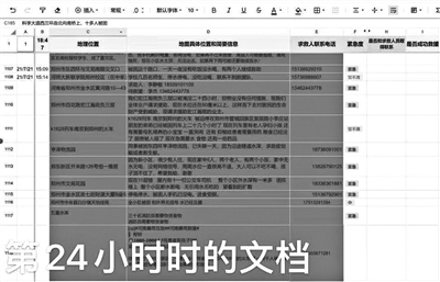 22日,Manto告诉北青报记者,7月19日晚,她看到社交平台上的各种求救信息不断涌入。但网络信息真假混杂,Manto感到很揪心。很快,她在朋友圈提出了自己的想法,“朋友们,主要是看微博真的心态崩了,现在目前想法是,整理网上的各种求救信息,判断优先级;同步联系被困人员和求救人员;跟进后续救援情况;搜集新的救援联系方式。”在朋友圈中,Manto出示了“救命文档”的初始截图,呼吁大家一起出力帮忙,“很多老人小孩失联,救援供不应求,信息差太多,需要大家帮忙。”而她的这条朋友圈获得了30多个同学的响应。后来,她又建了几个群,很多志愿者加入。为了大家可以在线一起协同编辑、更新信息,她们选择了腾讯文档。