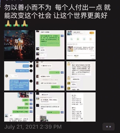 20日晚9点26分,她和两个朋友创建了第一个微信群:郑州求助信息汇总。不到半小时,群里就涌进了近400人,他们间多是陌生人,复制、粘贴各处看到的求助和救援信息,转发到微博、微信群和朋友圈。群里的消息,就像当晚的大雨一样,几十秒时间,就有三四十条。