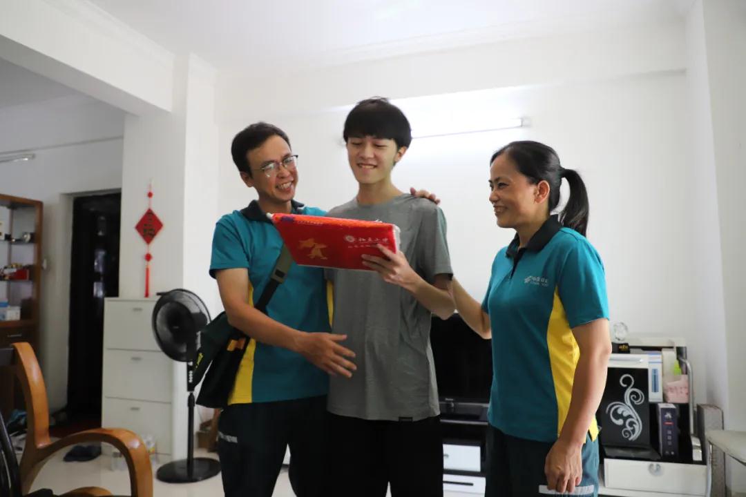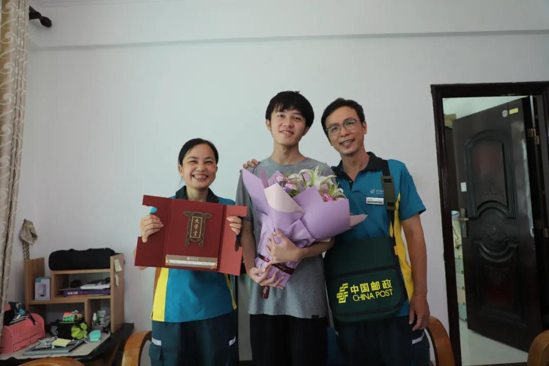 欣喜地将高考录取通知书交到儿子卢海山手中