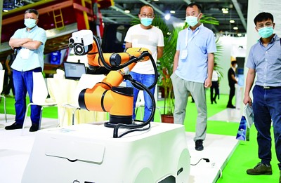 观众在2021广州国际汽车技术展览会上观看一台汽车充电机器人演示自动充电。新华社发