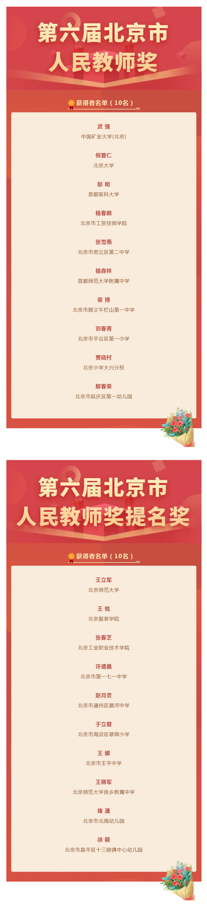 经市政府批准,授予中国矿业大学(北京)武强、北京大学倪晋仁等10名教师“北京市人民教师”称号。对北京师范大学王立军、北京服装学院王锐等10名“北京市人民教师提名奖”获得者予以表彰奖励。