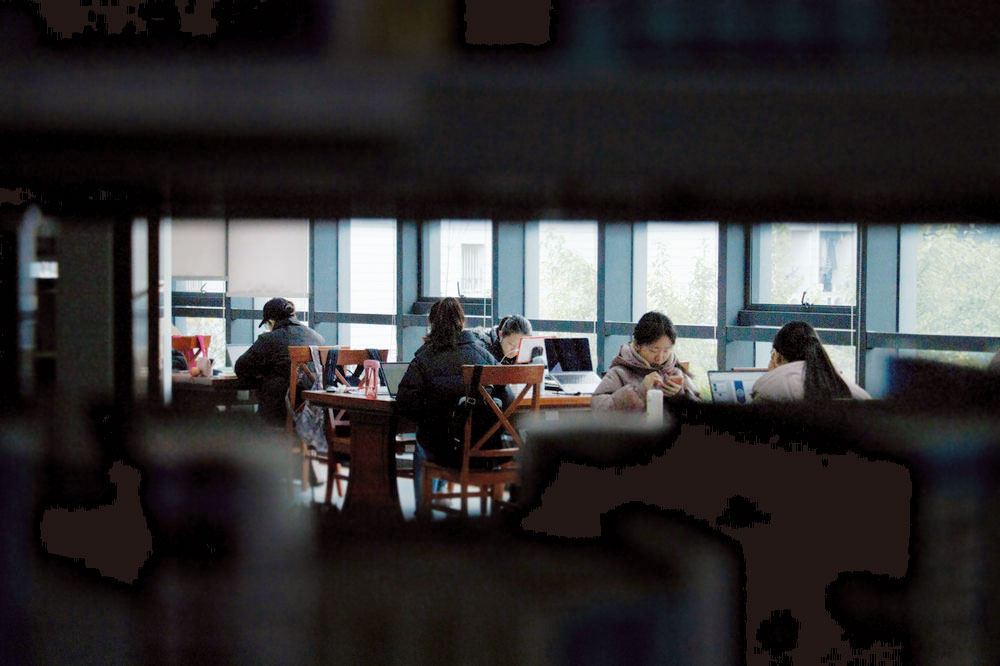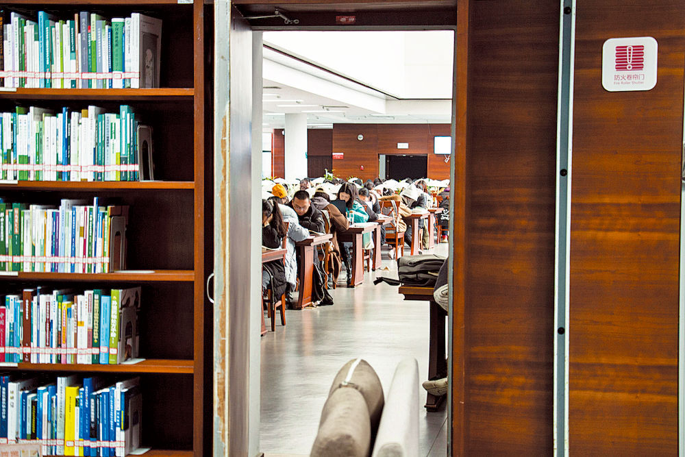 晚上7点,图书馆里虽然还有空位,一位女生却选择站着复习,她目不转睛地盯着复习资料,阅读与背诵。