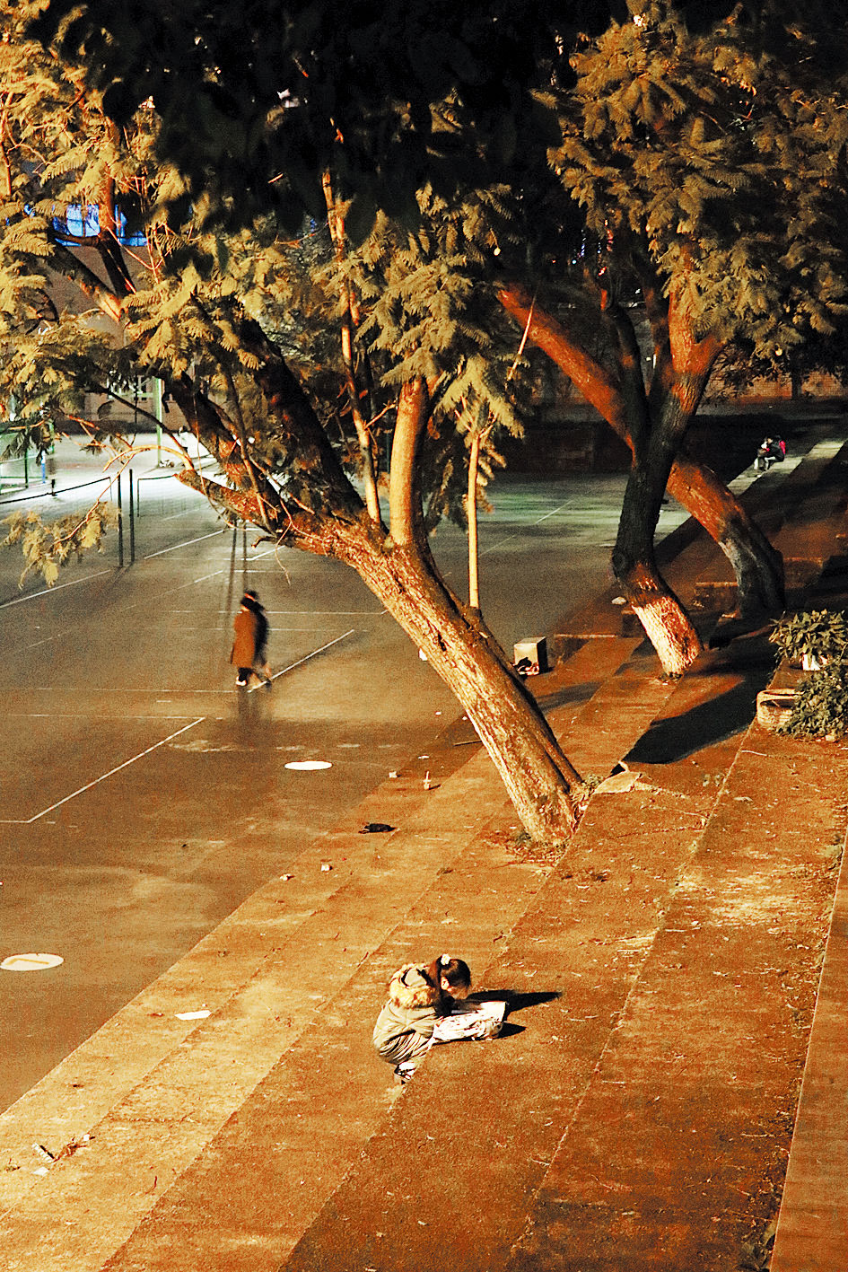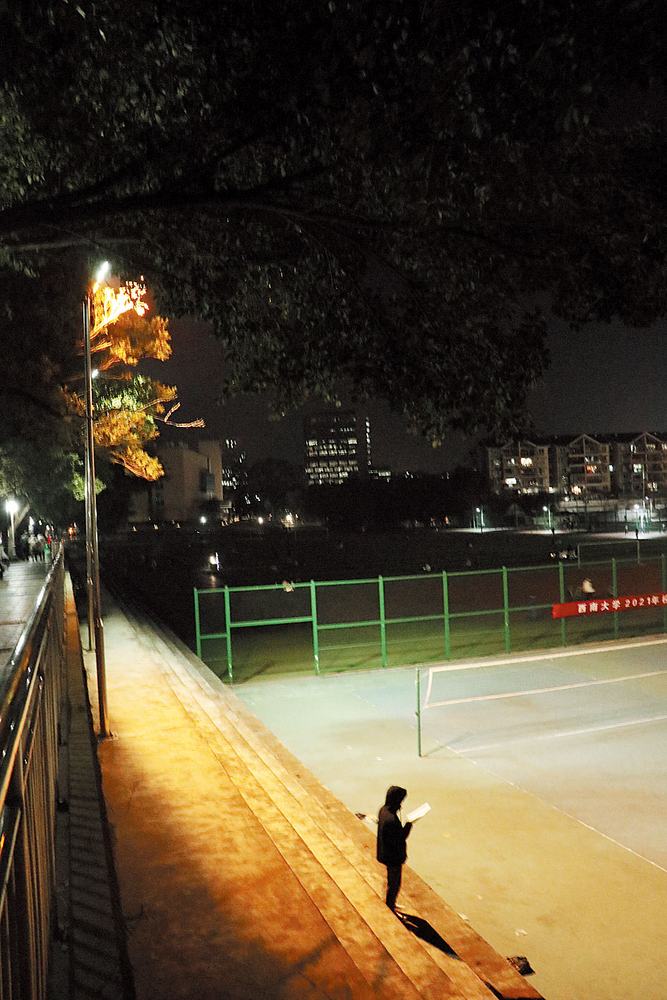 西南大学第四运动场旁的阶梯上,一女生蹲在路灯下复习。