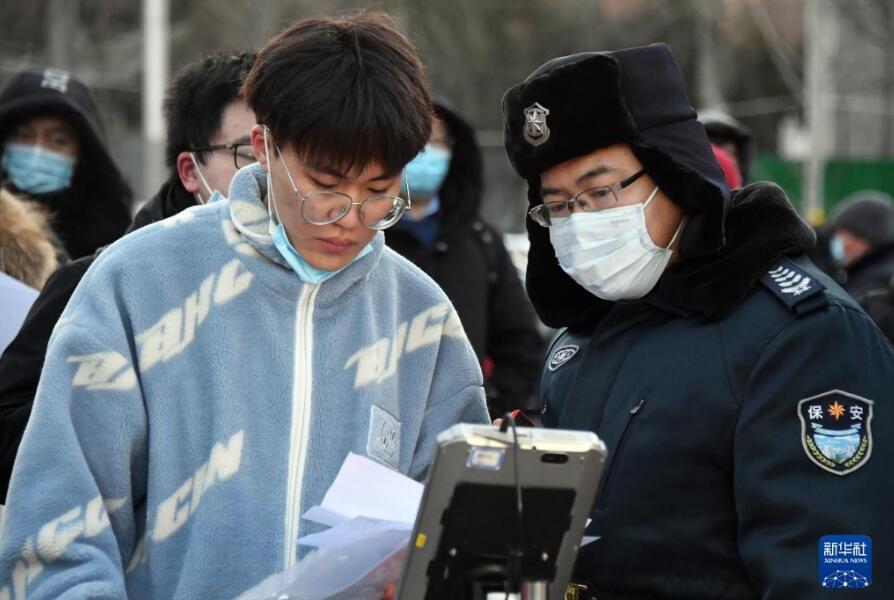 12月25日,在北京理工大学考点,工作人员(右)通过人脸识别的方式核对考生信息。当日,2022年全国硕士研究生招生考试拉开帷幕。新华社记者 任超 摄