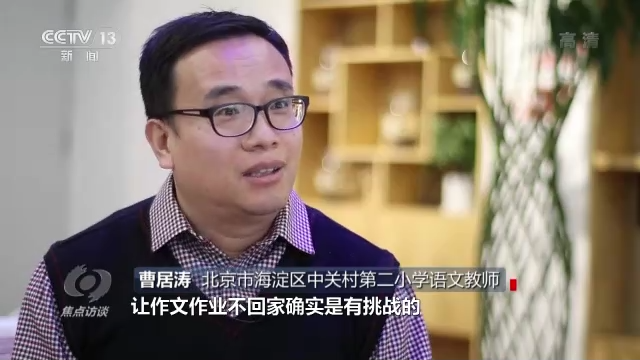 北京市海淀区中关村第二小学语文教师曹居涛说:“比如说高年级的作文,让作文作业不回家确实是有挑战的,所以我们就对教与学的方式进行了大胆的尝试和改变。从习作布置的时间上进行了改变,叫任务前置。孩子学习单元之初,要了解这一单元当中的习作主题是什么,让孩子的习作和生活建立联系。”