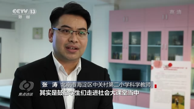 北京市海淀区中关村第二小学科学教师张涛说:“在这个过程当中,其实是鼓励学生们走进社会大课堂当中,去发现生活中的一些科学问题,收集一手资料,去解决科学问题。”