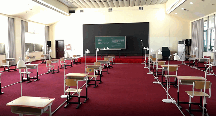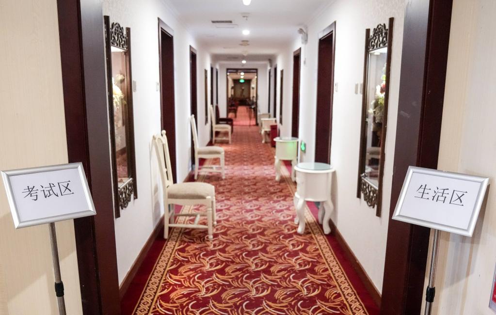 在管控区,考生可多人一考场,考位间距不小于2米。在北京一个管控区考点,一家酒店的会议室被布置成可容纳30个考生的考场,学校的课桌椅、黑板被搬入这里。为弥补灯光不足,工作人员还给每个考生准备了一个落地台灯。在生活区房间内,牙膏、牙刷、毛巾等生活用品及一些防疫物资也为考生配备齐全。