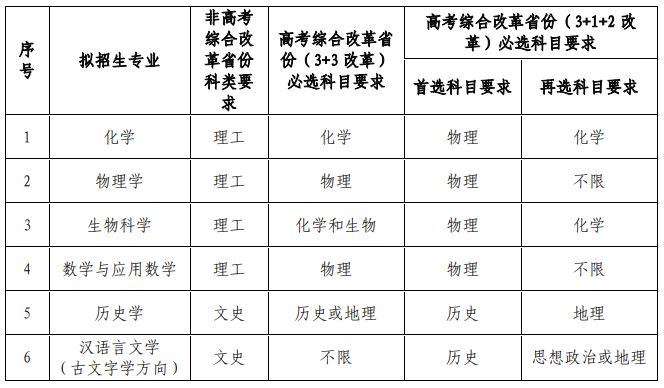 我校2022年强基计划具体招生专业及相关要求见下表,具体分省招生计划详见兰州大学强基计划报名系统。考生科类(高考综合改革省份的选考科目)须与我校相关专业要求相匹配。