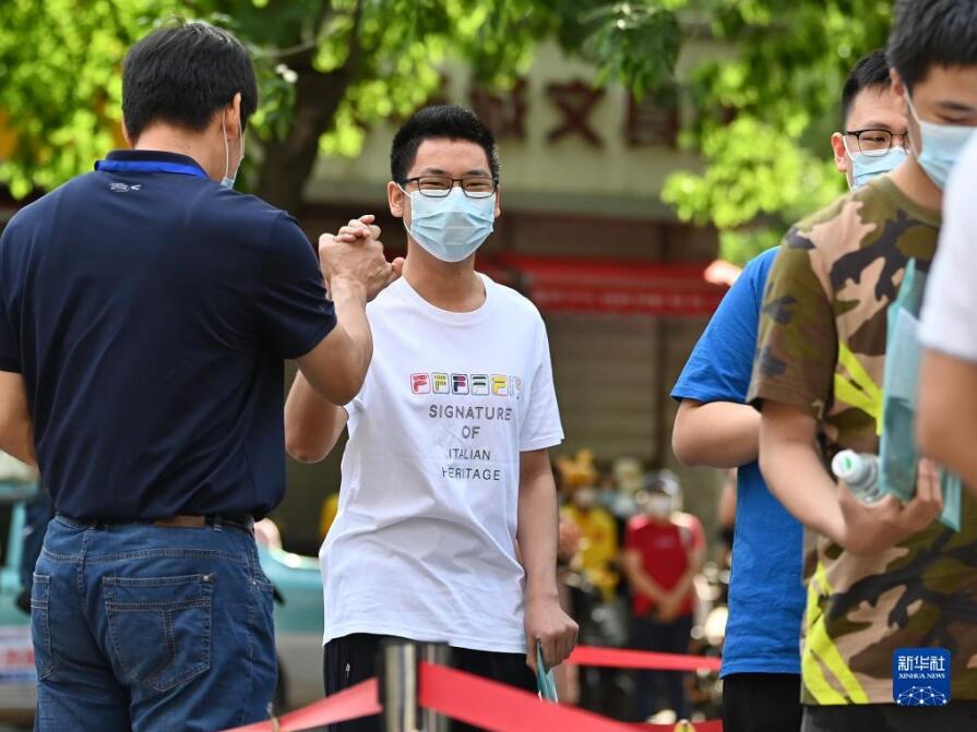 6月7日,在天津市耀华中学外,考生和老师击掌。