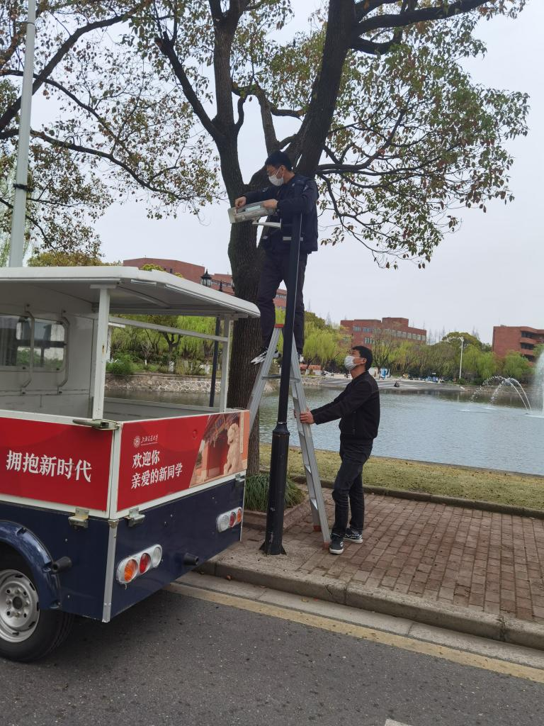 今年上海疫情防控期间,蒋家杰(左)巡查维保校园设备。受访者供图