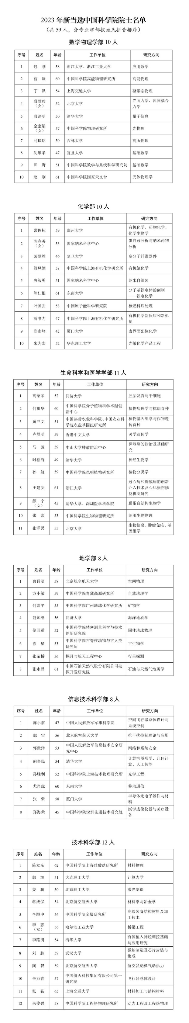 关于公布2023年中国科学院院士增选当选院士名单的公告