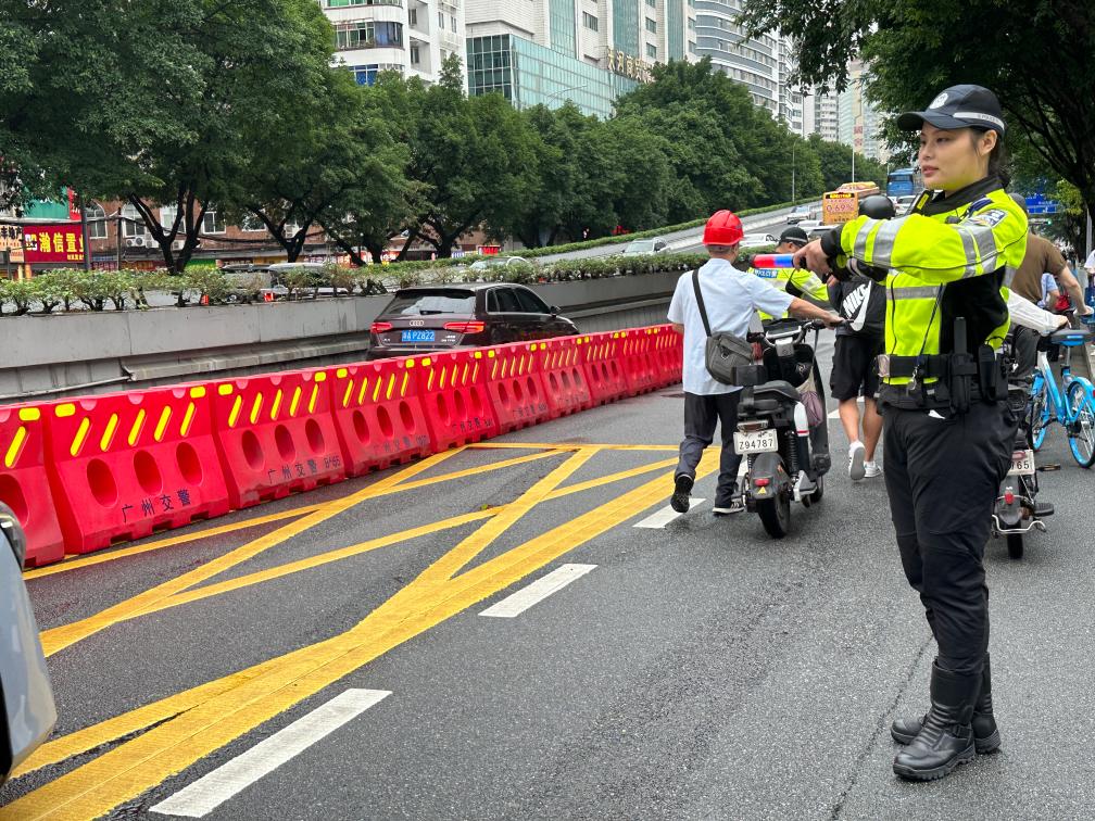 6月7日上午,交警在华南师范大学附属中学考点外指挥交通。新华社记者杨淑馨 摄