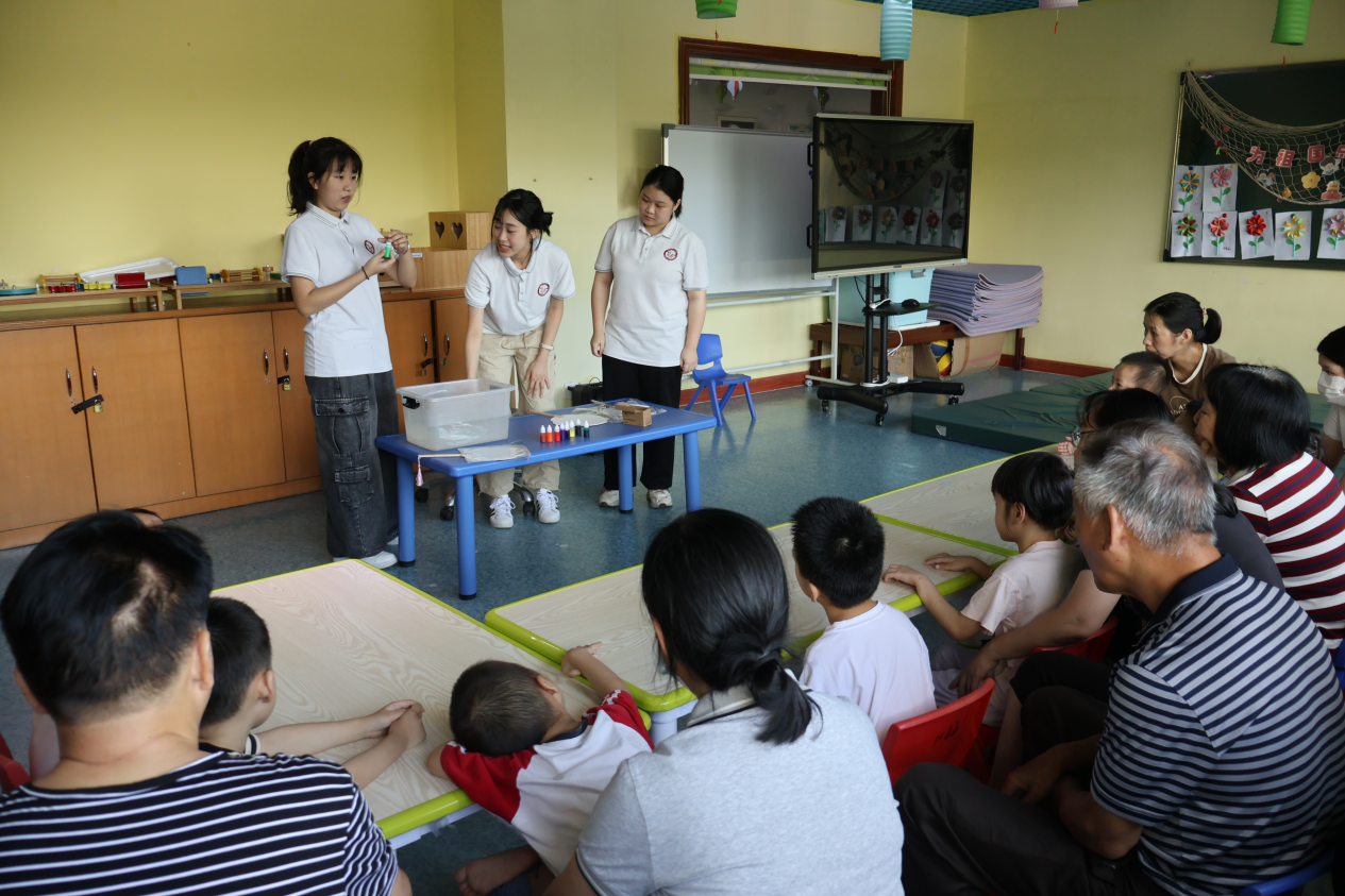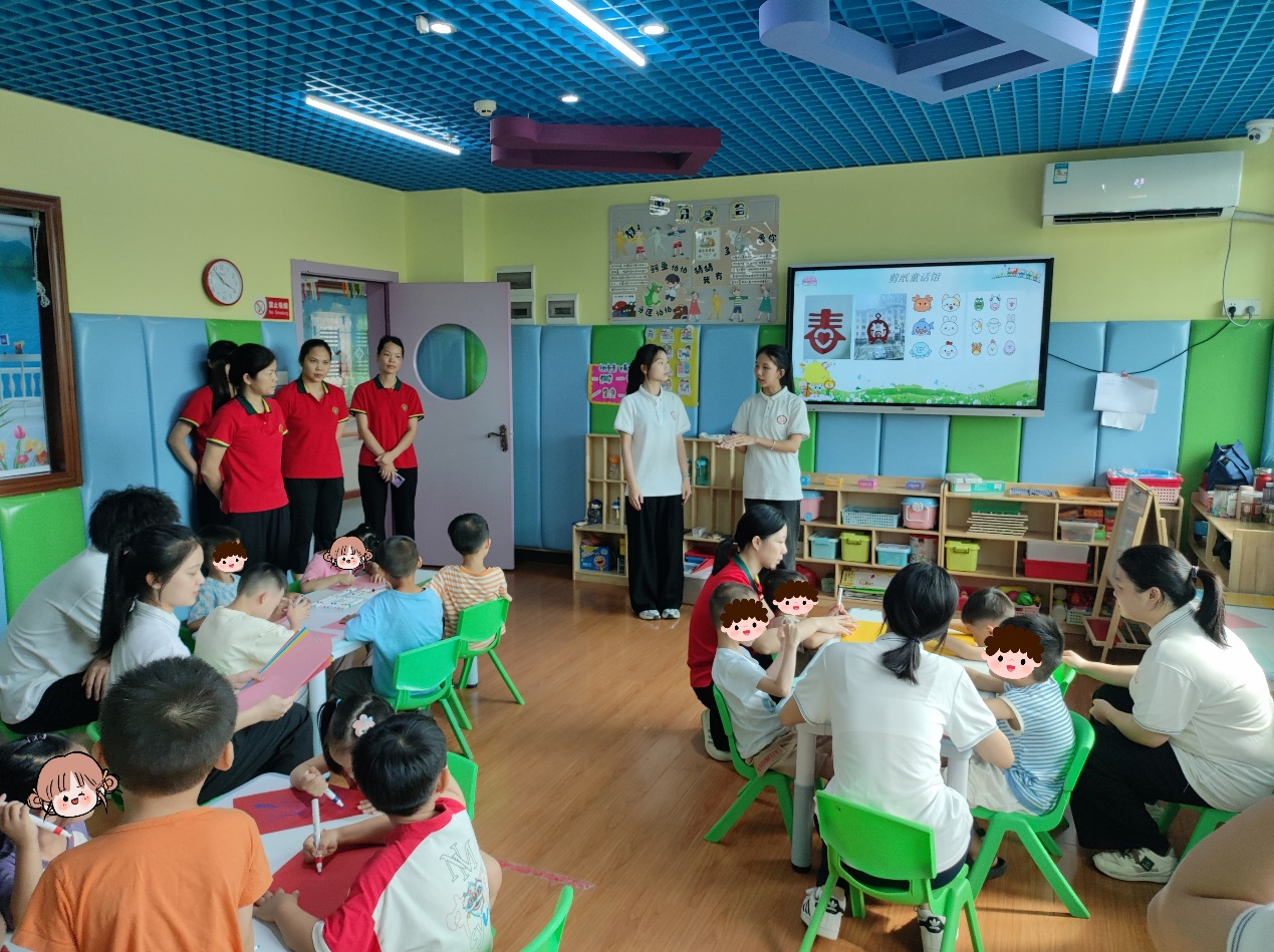 7月9日,突击队前往语言、社交、动手能力较弱的孤独症亲子班课堂,担任临时家长角色给予儿童一对一的互动和陪伴。在折纸课堂上,成员们与幼儿亲密互动,观察他们的行为特点,秉持细心、爱心、耐心的原则陪伴引导幼儿完成折纸作品。在成员们的悉心陪伴与积极鼓励下,幼儿逐渐敞开了心扉,积极主动地参与交流互动。