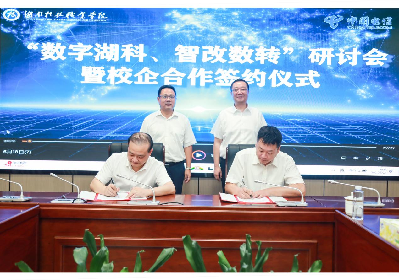近日,湖南科技职业学院与中国电信股份有限公司长沙分公司在天翼云中南数字产业园举行“数字湖科、智改数转”研讨会暨校企合作签约仪式,并为“湖南科技职业学院产教融合实践中心”揭牌。