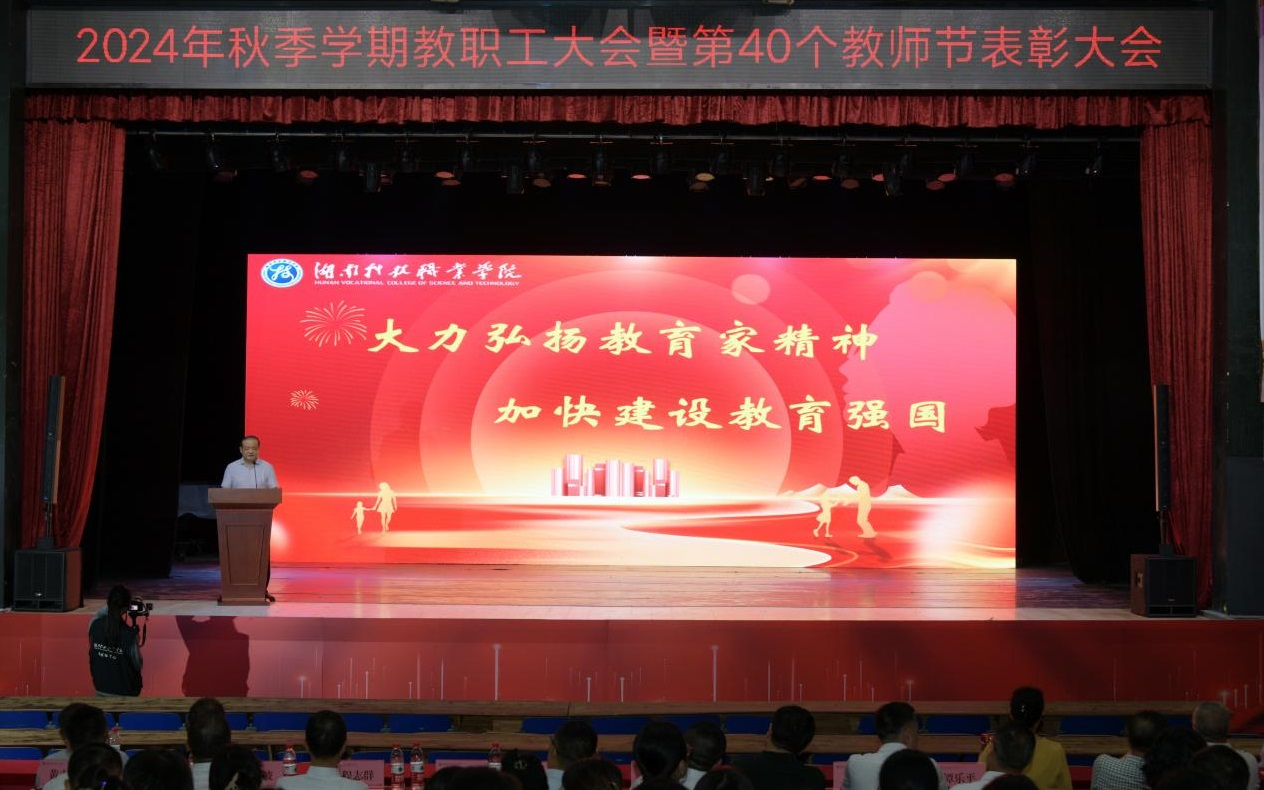 金秋九月,杏坛飘香。近日,在第40个教师节来临之际,湖南科技职业学院在该校雨花校区大礼堂隆重举办2024年秋季学期教职工大会暨教师节表彰大会。大会以“大力弘扬教育家精神,加快建设教育强国”为主题。学校党委书记杨翠明出席并作重要讲话,全体校领导、教职工和退休教职工代表共计700余人参加会议。大会由党委副书记、校长蒋阳飞主持。