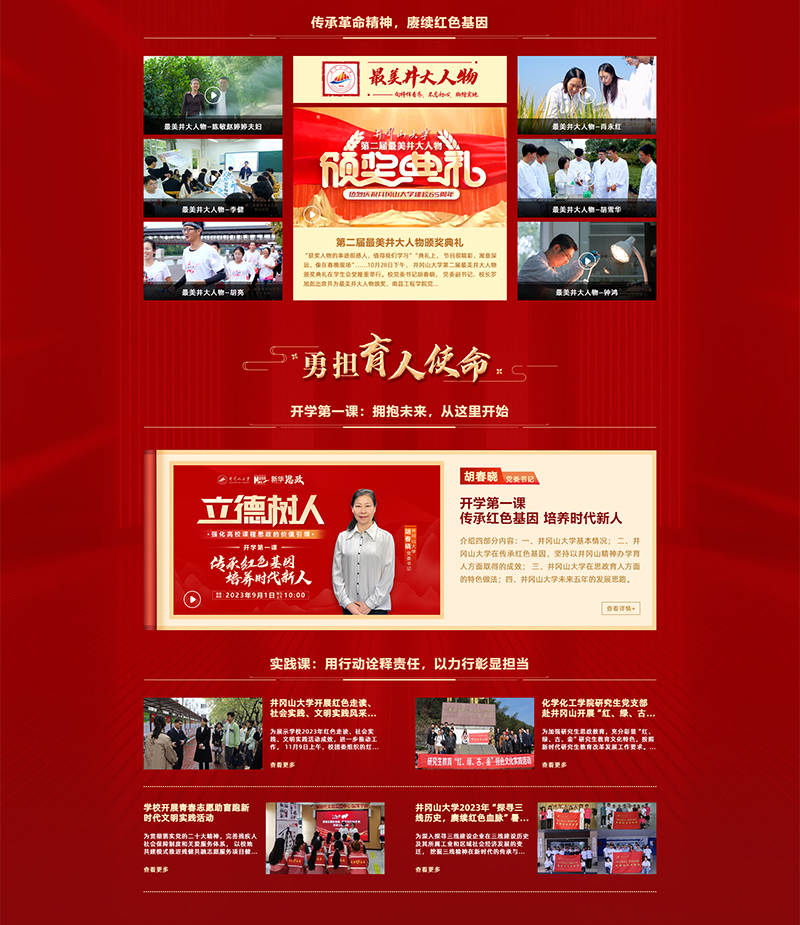 学校开设开学第一课、实践课、课程思政示范课,展现育人经验和教学成果,为学生注入精神能量,推动优质教学资源更大范围内共享,全方位贯彻“以井冈山精神办学育人”的理念。