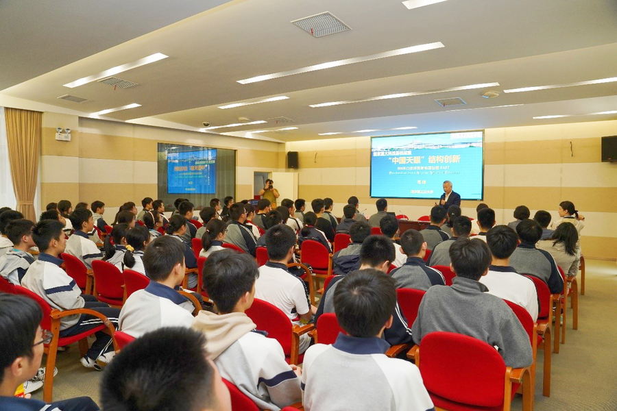 范峰与上海师范大学附属中学党委书记严一平、校长黄岳辉,建平中学校长虞晓贞及师生代表座谈交流,并以《“中国天眼”结构创新》为题为建平中学学子作科普报告。他在报告中介绍了世界最大单口径射电望远镜“中国天眼”(FAST)结构系统科研攻关的历程和在“中国天眼”立项及工程实施过程中,哈工大科研团队在开展关键结构技术预研、提供主动反射面结构总体方案等方面作出的重要贡献。