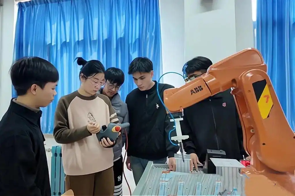 越南留学生在山东交通职院实训室学习、了解机器人手臂 / 图源:职教之音