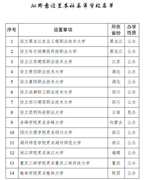 1月12日,教育部网站发布《关于拟同意设置本科高等学校的公示》。