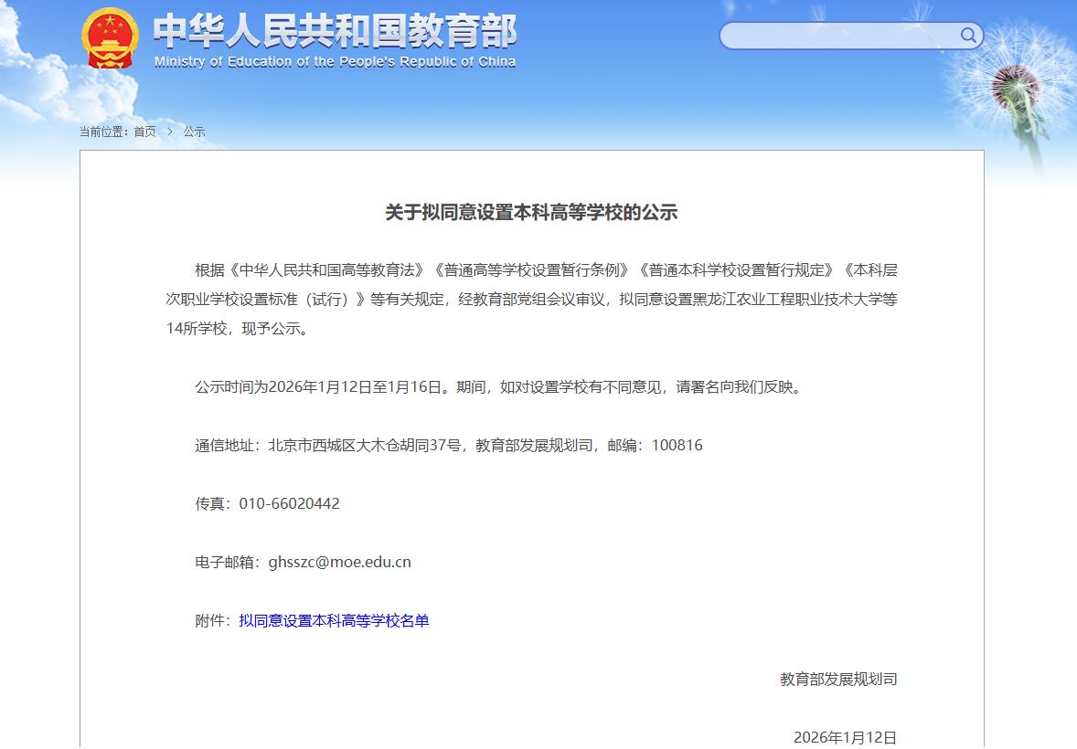 根据《中华人民共和国高等教育法》《普通高等学校设置暂行条例》《普通本科学校设置暂行规定》《本科层次职业学校设置标准(试行)》等有关规定,经教育部党组会议审议,拟同意设置黑龙江农业工程职业技术大学等14所学校,现予公示。公示时间为2026年1月12日至1月16日。