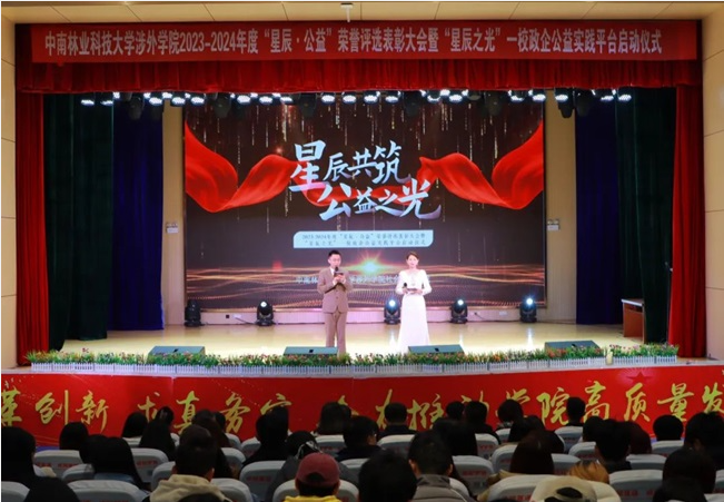 为深入学习贯彻党的二十届三中全会精神,探求公益人才培养的新路径,以整合统筹校内外资源服务地方作为工作方向,汇聚政企校等多方力量共同打造公益实践平台,近日,2023-2024年度“星辰•公益”荣誉评选表彰大会暨星辰之光——校政企公益实践平台启动仪式在中南林业科技大学涉外学院举办,社会各界爱心人士、热心公益的志愿者们齐聚一堂。此次活动旨在表彰2023-2024年度在公益领域贡献杰出的个人及组织,吸引和支持青年大学生踊跃投身公益事业,促成教育与社会公益的共生共荣。