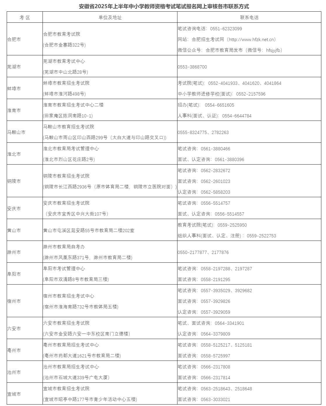 (七)政策咨询电话:0551-64495743、64495938,笔试报名期间考务咨询电话:0551-63611207。