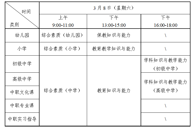 (三)全国统一考试时间为3月8日,各类别考试科目与时间安排如下: