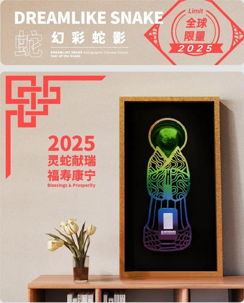 据介绍,《幻彩蛇影》运用现代光学科技手段,蛇头采用反射式数字全息影像,蛇身选用幻彩光变金属材质,巧妙地呈现蛇像拜年的姿态。蛇头空间后部的光环,象征着圆融和谐,寓意新的一年里万事顺遂、圆满如意,为观者带来视觉与精神上的双重享受,每一版蛇身的色彩均不同,成为了独特的全息幻彩盲盒,为观者带来独一无二的体验。据悉,该作品限量发售2025件,均由北京印刷学院全息艺术实验室师生手工精心制作,每件都拥有专属收藏编号。