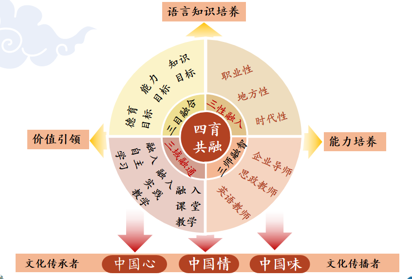 在“四融共育”的课程思政建设理念的指导下,推进英语课程的价值引领、语言知识和能力培养的有机融合。夯实育人基础,开拓学生国际视野,培养学生文化认同、文化自信和家国情怀,铸牢中华民族共同体意识。简而言之,就是培养学生成为具有“中国心”、饱含“中国情”、充满“中国味”的文化传承者和文化传播者。
