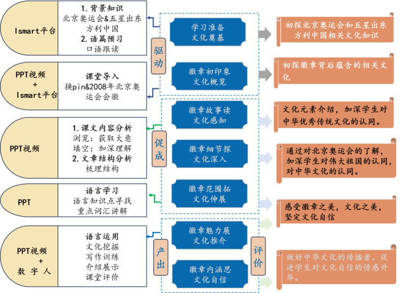 教学团队将“知识传授-能力培养-价值引领”有机融入。以《舞动的北京》单元教学为例,设计“文化储备-文化概览-文化感知-文化深入-文化推介 -文化认同”的教学链条,通过分析北京奥运会会徽所蕴含的中华文化,帮助学生感受徽章之美、中华文化之美,培养学生的文化自信和传播中华文化的跨文化交际能力。