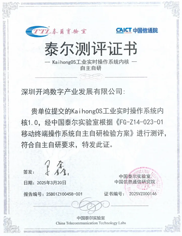 近日,深开鸿自主研发的KaihongOS工业实时操作系统内核,通过中国信息通信研究院泰尔系统实验室检测认证。这标志着深开鸿在操作系统自主研发方面获得新成果。