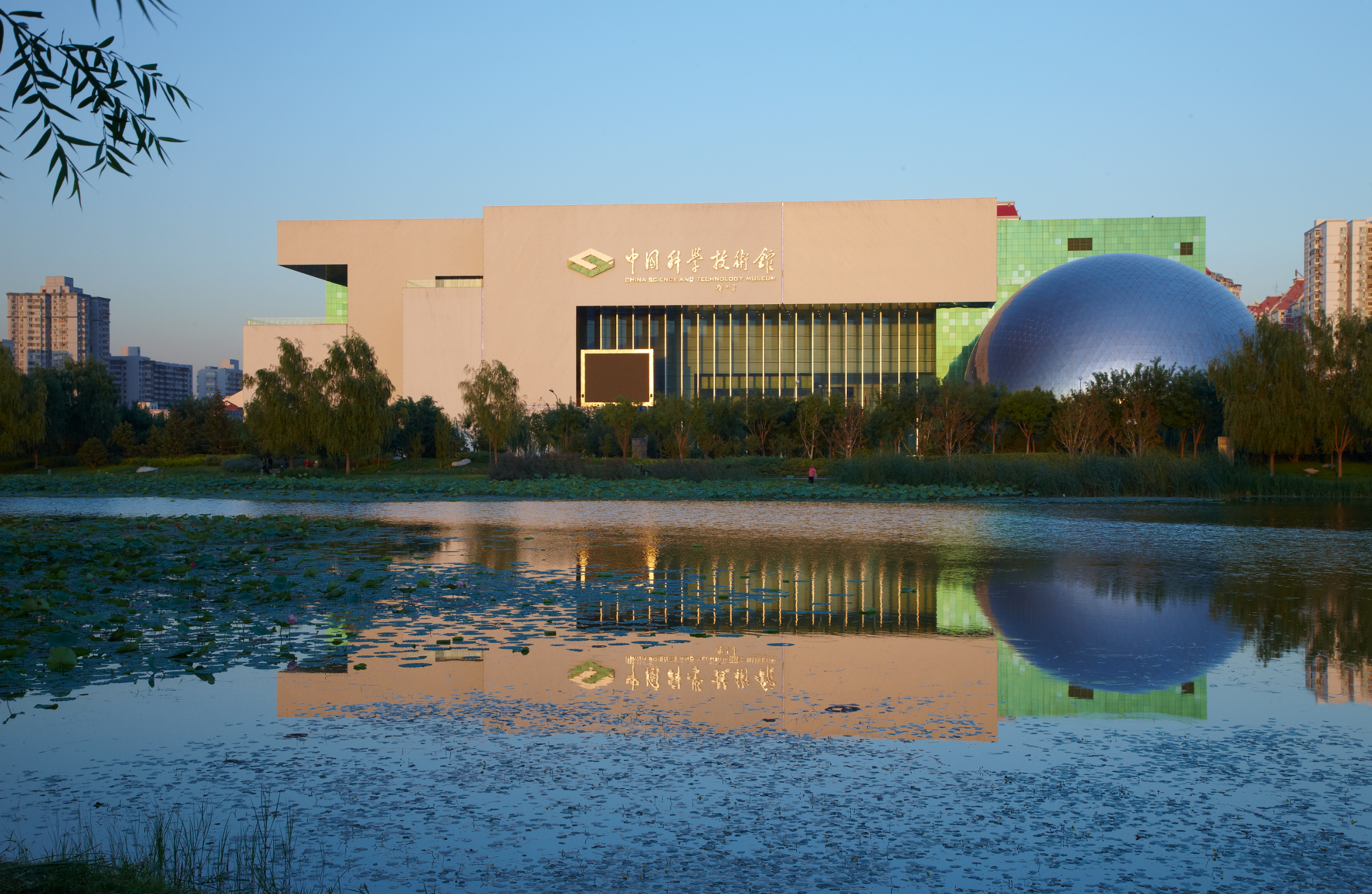 中国科技馆新馆位于朝阳区北辰东路5号,于2009年9月16日正式开放,建筑面积10.2万平方米,其中展教面积4.88万平方米。新馆建筑整体是一个体量较大的单体正方形,利用若干个积木般的块体相互咬合,使整个建筑呈现出一个巨大的“鲁班锁”,又像一个“魔方”,蕴含着“解锁”“探秘”的寓意。新馆设有“科学乐园”“华夏之光”“探索与发现”“科技与生活”“挑战与未来”五大主题展厅、短期展厅、公共空间展示区及球幕影院、巨幕影院、动感影院、4D影院等四个特效影院,其中球幕影院兼具穹幕电影放映和天象演示两种功能。此外,新馆还设有多间实验室、科学教室、科普报告厅、多功能厅等。