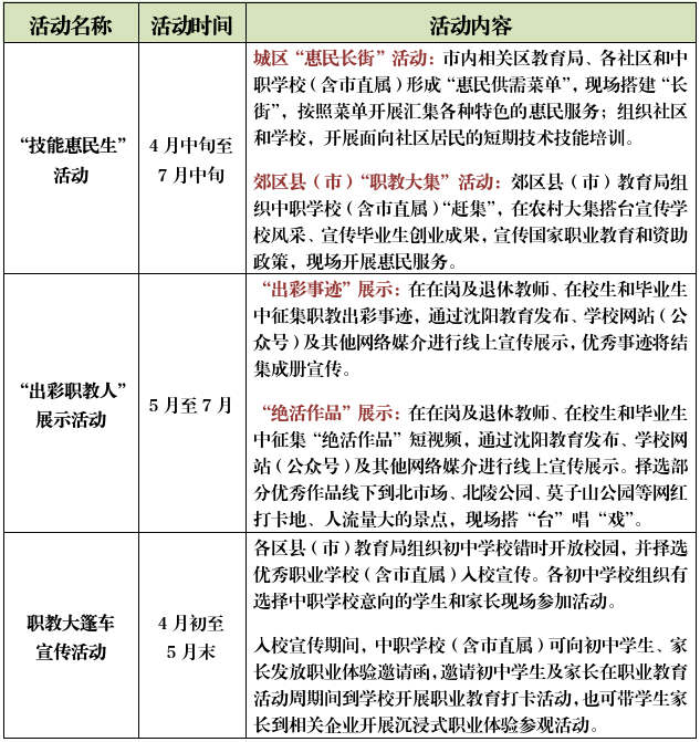 为充分展示沈阳职业教育改革与发展成果,不断提升职业教育社会影响力,沈阳市教育局在2025年4月初至7月中旬期间,组织开展2025年“职教幸福行”暨职业教育宣传周系列活动。