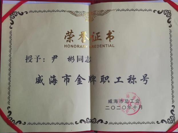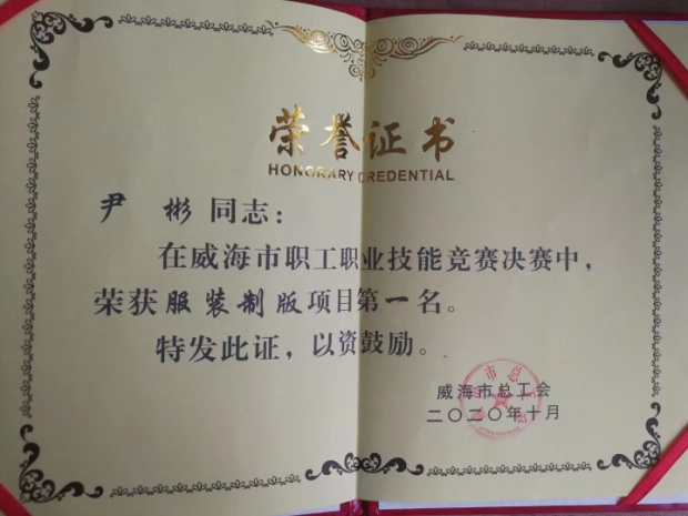 2020年,尹彬参加由威海市总工会组织的威海市职工职业技能竞赛。竞赛要完成理论测试和实操测试。服装制版组给定的考题版型复杂、时间紧张,手工制版、裁剪、缝制和整烫等全部工序要一人完成,限定时间4小时,对选手综合能力和临场应变能力提出高要求。在严格的综合能力考验下,尹彬从容应战,凭借过硬技术和稳定心态,稳定发挥,夺得“威海市职工职业技能竞赛决赛服装制版项目第一名”的优异成绩。同年,尹彬荣获威海市总工会颁发“威海市金牌职工”荣誉称号。