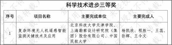 近日,天津市人民政府发布了《关于颁布2024年度天津市科学技术奖的决定》的通知,北京科技大学天津学院信息工程学院无人系统应用研究院杨凯欣教授主持申报的“复杂环境无人机遥感智能监测关键技术及应用”项目获科学技术进步三等奖。这是学院首次荣获天津市科学技术奖,为建校20周年校庆献上了一份贺礼。
