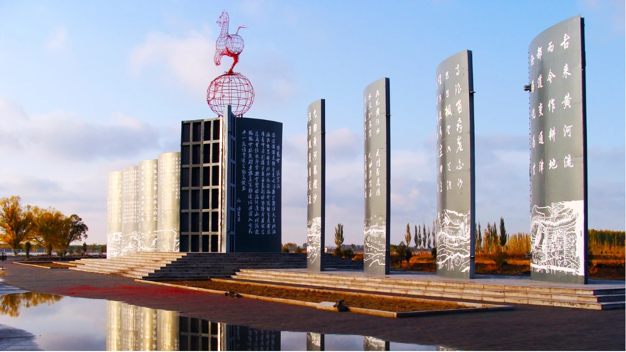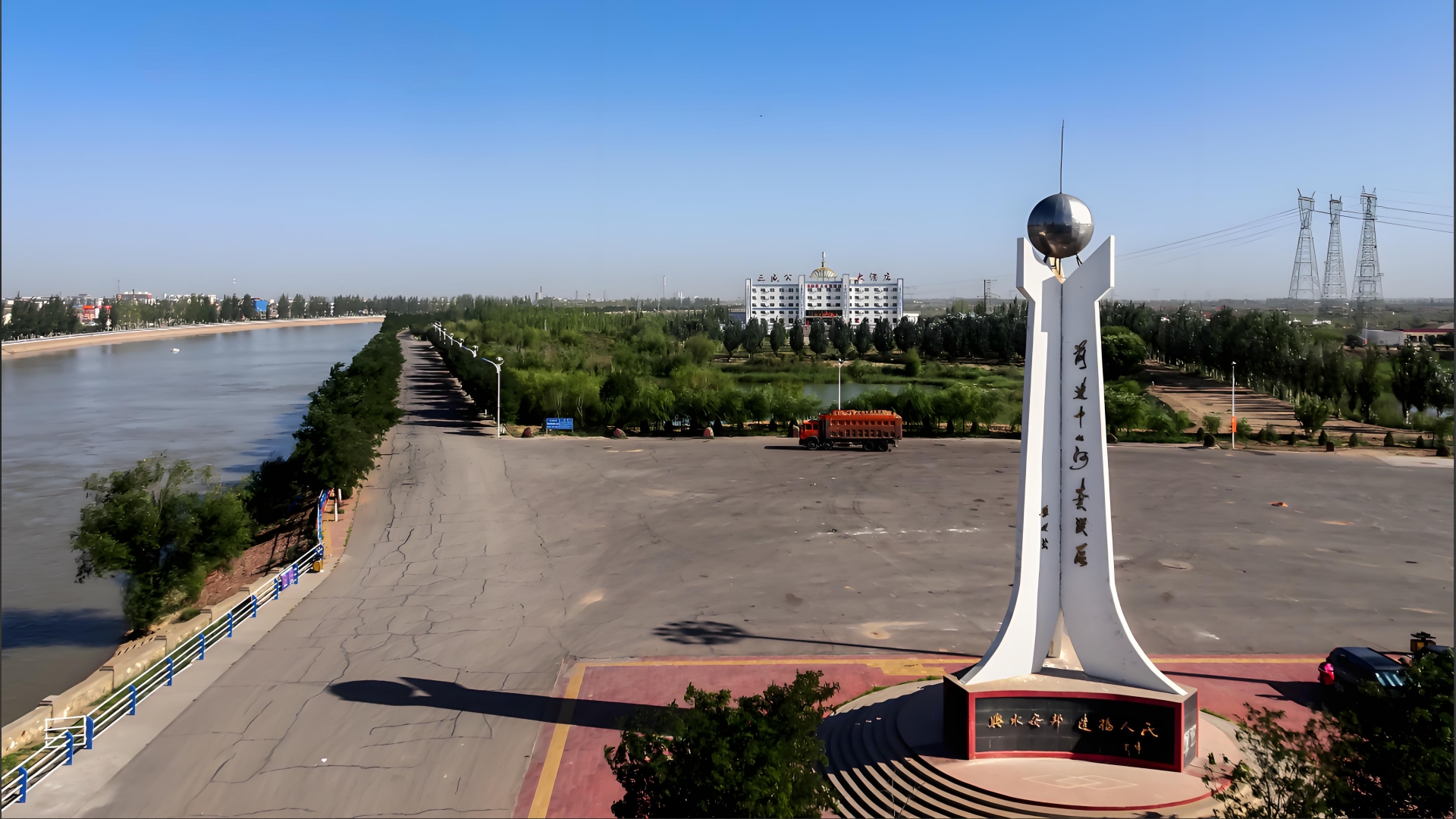 三盛公枢纽工程纪念碑及总干渠(左侧)