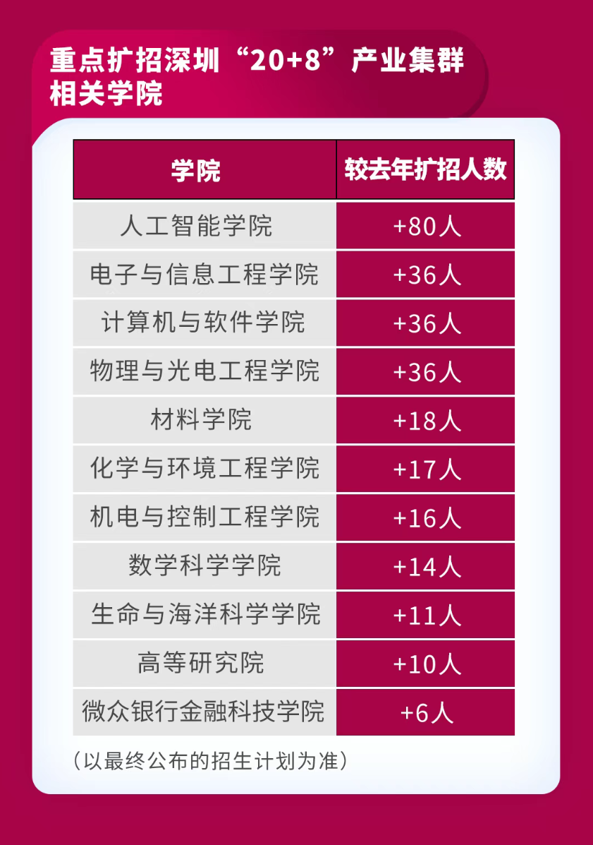 学校2025年重点扩大深圳“20+8”产业集群相关学院专业招生规模。11个学院累计扩招280人。