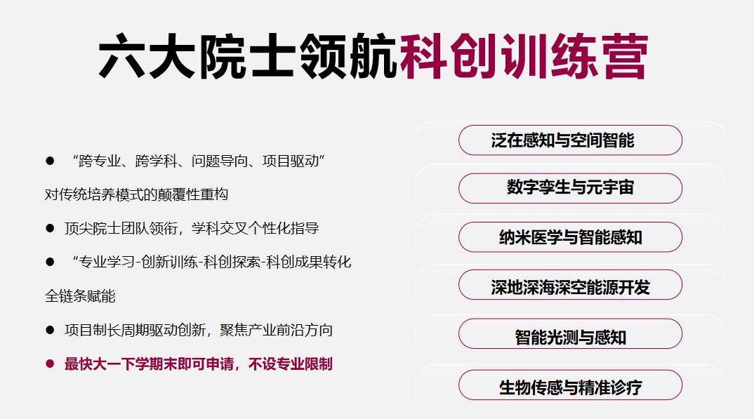 在校学生最快于大一下学期末即可参与训练营的选拔,不设专业限制。入选学生将得到双导师团队的个性化指导。在训练营中表现优异、成果突出的学生,将有机会获研究生推免资格;如在本校攻读研究生,还可选择由院士及核心团队老师担任研究生导师,促进成果继续深化和迭代更新。