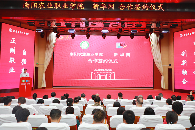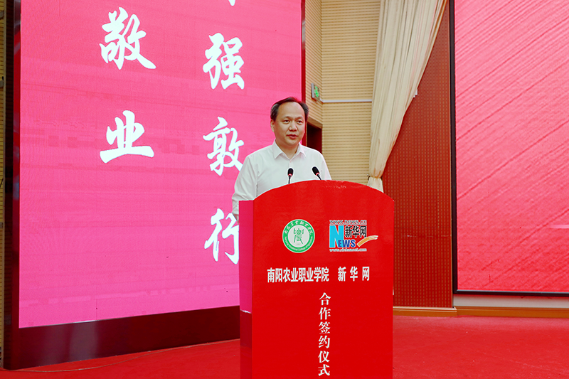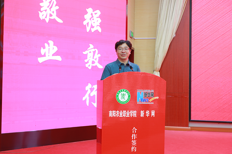 丁笑生在致辞中表示,学校与新华网的紧密合作,是双方共同落实总书记重要指示精神和党的二十大战略部署的关键行动,更是响应时代命题、锻造新时代“一懂两爱”新农人的战略抉择。他表示,南阳农业职业学院肩负服务教育强国、农业强国建设和乡村振兴的时代重任,深化课程思政建设,培养德技并修的高素质技术技能人才是学校的核心使命。他表示,本次合作是一次优势互补的强强联合,新华网权威资源与宛农深厚职教基础的结合将产生强大协同效应;也是一场守正创新的教学革命,双方将根植南阳产业、文化沃土,打造“有泥土味、带科技感、具中国心”的思政育人新范式;更是一份面向未来的承诺,学校将与新华网精诚合作、攻坚克难,合力培养兼具“乡土、匠心、担当”情怀的新农人。