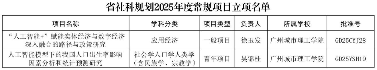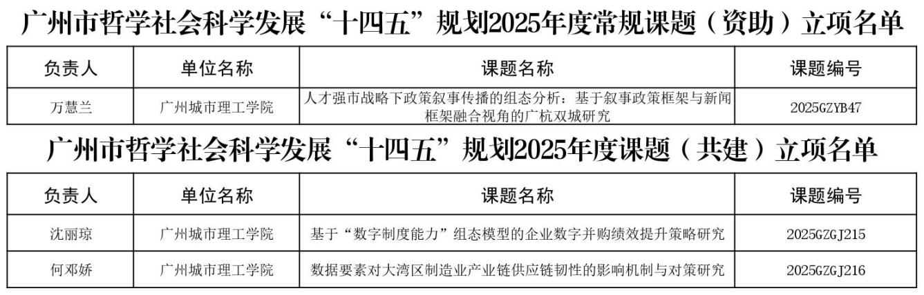 近日,《广州市哲学社会科学发展“十四五”2025年度常规课题(资助)立项的通知》(穗社规办〔2025〕5号)和《关于广州市哲学社会科学发展“十四五”规划2025年度常规课题(共建)立项的通知》(穗社规办〔2025〕6号)发布,广州城市理工学院获3项立项项目,其中包括一般项目1项、共建项目2项。这是继今年5月,学校斩获2项广东省哲学社会科学规划项目后的又一重要突破。