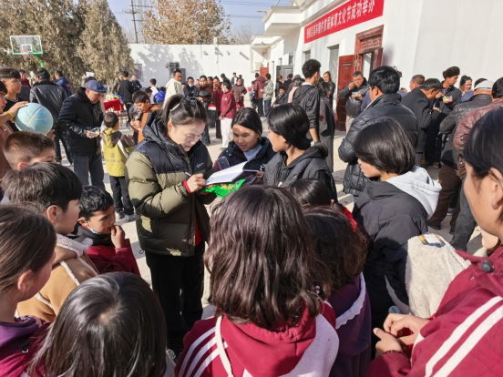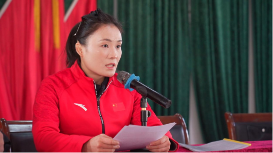 冠军分享传力量,示范互动燃激情。作为活动的核心亮点,荣宁宁带来了题为《以奋斗为翼 向梦想前行》的主题报告。她结合自身从基层训练到征战国际赛场的拼搏历程,向现场村民和同学们讲述了面对伤病困扰、训练瓶颈时的坚持与突破,传递“平凡人也能通过奋斗实现梦想”的精神力量,引发全场强烈共鸣。荣宁宁还向同学们赠送了签名订制笔记本,扉页上“逐梦路上,不负韶华”的寄语承载着对乡村学子的期许。