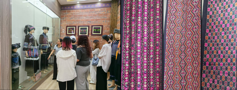 在连山壮族瑶族自治县,壮瑶风采锦绣专业合作社的织锦艺人用古老的木织机,为团队展现了壮锦织造的流程。从蚕茧抽丝、染线配色,到纹样设计、经纬穿梭,每一道工序都凝聚着匠人的心血与智慧。团队成员近距离观察了壮锦核心纹样的构图逻辑,记录了传统配色的文化寓意,并细致研究了不同规格壮锦面料的质感、厚度与耐用性。合作社陈列的传统壮锦背扇、壁挂等作品,让团队直观感受到壮锦在传统生活场景中的应用形态,更深刻理解了纹样背后承载的民族文化内涵。通过与合作社艺人的交流,团队还了解到当前壮锦传承面临的现实挑战,如织造周期长、年轻传承人短缺、产品形态单一等,这也让团队更加坚定了通过现代设计激活传统工艺的决心。
